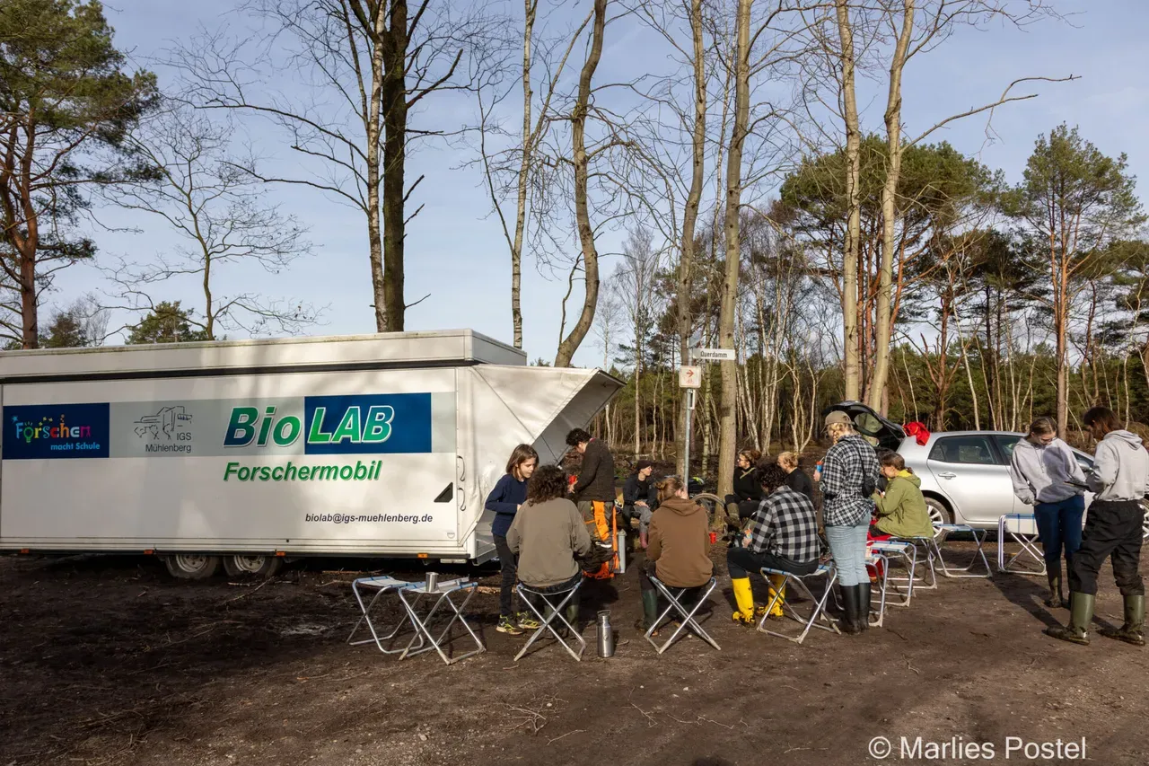 „Das BioLAB-Forschermobil ist ein rollendes Klassenzimmer für Exkursionen und freilandbiologischen Unterricht mit Schulklassen. Mit dem BioLAB können Schülerinnen und Schüler die Ökosysteme Wald, Moor, See und Fließgewässer erkunden und chemische Werte beproben. Und auch gleich ihre Gruppenergebnisse mit den anderen Stationsgruppen teilen. Initiiert wurde das Projekt von unserem Biologielehrer Matthias Grützmacher. Nach seinem frühem Tod haben wir als aktive und ehemalige Schüler*innen das Projekt 2021 übernommen und führen dies nun weiter. Das gesteckte Ziel, die regulären Exkursionen weiterhin anbieten zu können, hat, auch Dank der Hilfe von vielen Freiwilligen, in den letzten Jahren sehr gut funktioniert. Nun sollen die Kapazitäten ausgebaut werden, um das Angebot auch für weitere Schulen zu eröffnen. Besonders ist bei diesem Projekt die frühe Übernahme von Verantwortung durch mitwirkende Schülerinnen und Schüler. Sie erlernen die Grundlagen der Biologie und von ausgewählten Ökosystemen. So können sie dann im Rahmen der Exkursionen andere Schulklassen an Stationen unterrichten. Damit wird das Wissen auf einer niedrigschwelligen Ebene, von Lernenden an Lernende, weitergegeben. Dieses Konzept läuft im Projekt BioLAB bereits seit 2012 und hat mehrere Generationen an HiWis/Stationsbereuenden hervorgebracht. Aus diesem Pool setzt sich auch das aktuelle BioLAB-Team zusammen.