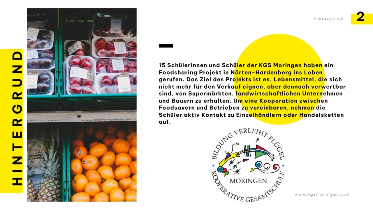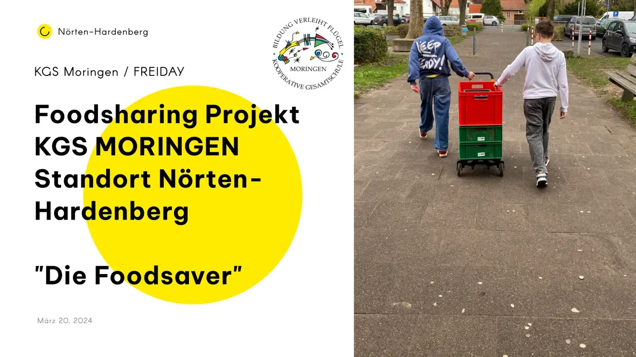 Schüler:innen der KGS Moringen haben ein Foodsharing Projekt in Nörten-Hardenberg ins Leben gerufen. Das Ziel des Projekts ist es, Lebensmittel, die sich nicht mehr für den Verkauf eignen, aber dennoch verwertbar sind, von Supermärkten, landwirtschaftlichen Unternehmen und Bauern zu erhalten. Um eine Kooperation zwischen Foodsavern und Betrieben zu vereinbaren, nehmen die Schüler:innen aktiv Kontakt zu Einzelhändlern oder Handelsketten auf. Diese Lebensmittel werden zunächst von den Schülerinnen eingesammelt, in Kooperation mit einem weiterem Schüler Projekt, dem Donnerstags Xpress. Mitgenommen werden Produkte mit abgelaufenem Mindesthaltbarkeitsdatum, aber auch Obst und Gemüse, das nicht mehr den optischen Standards der Händler entspricht, aber dennoch noch ansehnlich ist. Die gesammelten Lebensmittel werden entweder Donnerstags an Interessierte Mitbürger verteilt, die unentgeltlich zugänglich sind, unabhängig davon, ob jemand bedürftig ist oder einfach nur Hunger hat. Die Verteilung wird von den Schülerinnen wöchentlich an den Supermärkten abgeholt.