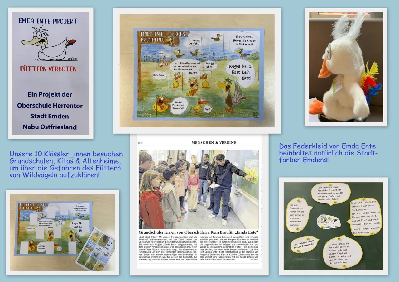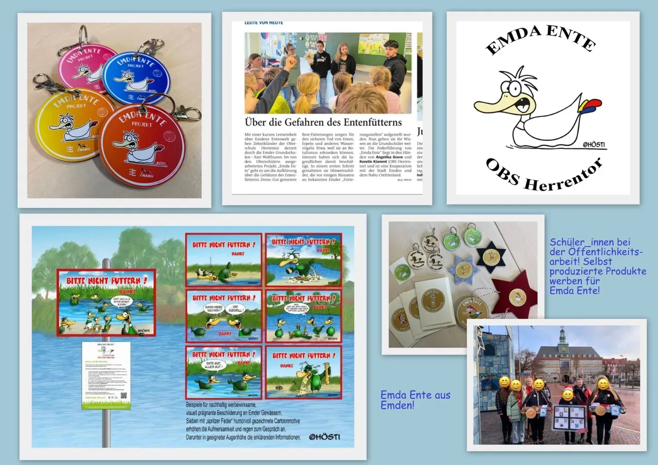Die Oberschule Herrentor aus Emden hat gemeinsam mit der Stadt Emden und dem NABU Ostfriesland das Projekt „Emda Ente“ gestartet. Sie wollen gemeinsam die Menschen in Emden durch Schilder und Flyer auf das Problem der Entenfütterung aufmerksam machen. Sehr große Unterstützung haben wir durch den bekannten Cartoonisten Stephan Höstermann „Hösti“ erhalten, der u.a. die „Emda Ente“ für uns gezeichnet hat. Der Clou an der Namensgebung ist der Städtename Emden. Emden ist Vorbild für den Vornamen unserer Ente „Emda“.
