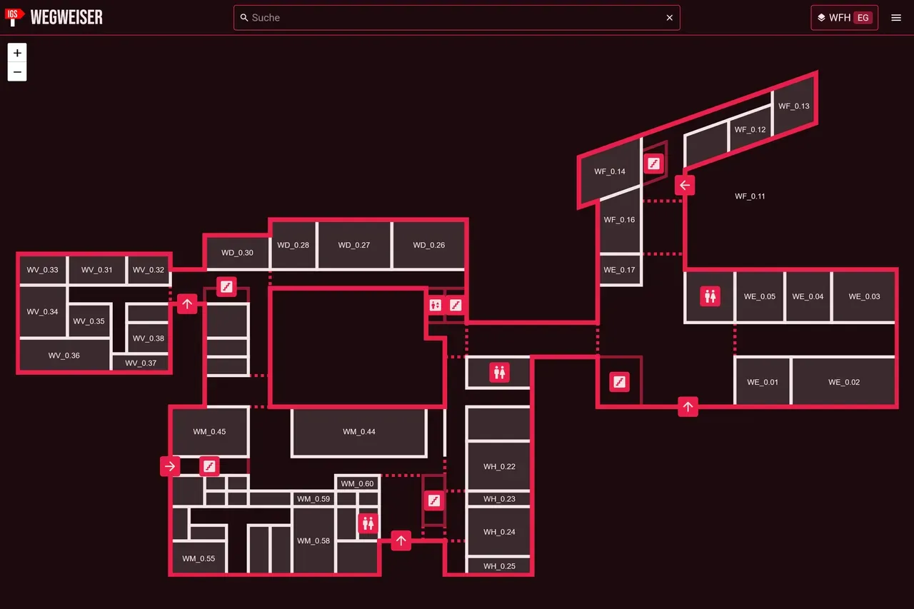 Die Webseite bietet eine digitale Karte der Schule, kombiniert mit einer intelligenten Suchfunktion. Nutzerinnen und Nutzer können Räume auf verschiedene Arten finden. Beispielsweise über den Raumnamen, Klassenbezeichnungen oder Funktionen wie Fachräume. Dadurch wird die Orientierung deutlich intuitiver und schneller als mit klassischen, statischen Aushängen.